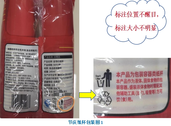 网络购检中发现绝大部分节庆类纸杯属于包装容器类纸杯。按照国家标准《纸杯》(GB/T 27590-2022)中对包装容器类纸杯的规定:作为液体、固体食物的包装容器,盛装液体食物时需配其他辅助工具(如勺、吸管等)方可饮(食)用。