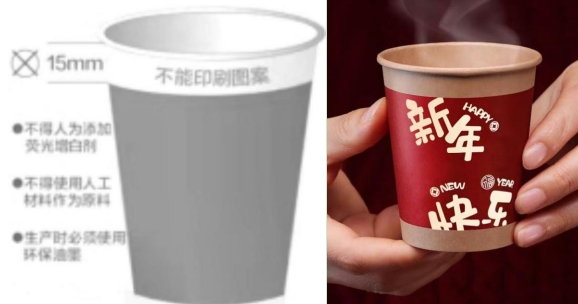 功能和杯身:国家标准《纸杯》(GB/T 27590-2022)中规定“杯口距杯身15mm(不含15mm)内不应印刷”,避免消费者使用时将印刷油墨食入口中;但此要求仅适用于直接饮用类纸杯,对包装容器类纸杯不适用;包装容器类纸杯盛装液体食物时需配其他辅助工具(如勺、吸管等)方可饮(食)用,消费者选购时一定要分清。如无特殊要求,最好选取无印刷的产品,以减少印刷油墨造成的影响。