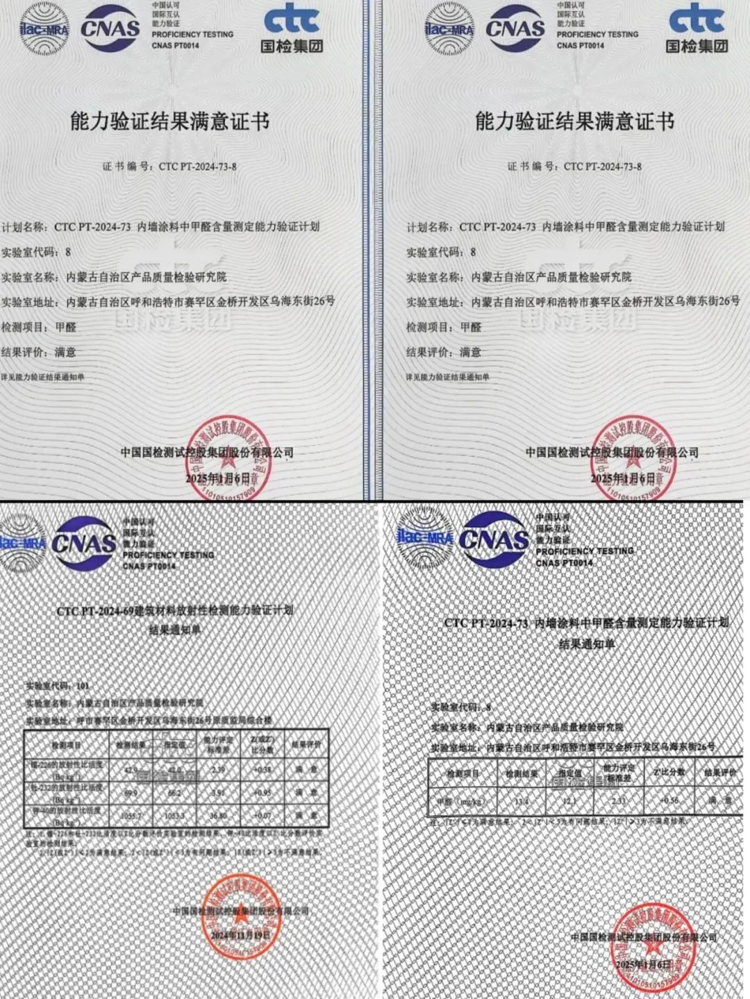 在近日揭晓的中国国检测试控股集团股份有限公司能力验证结果中,内蒙古自治区产品质量检验研究院建材检验中心顺利通过CTC PT-2024-73内墙涂料中甲醛含量测定及CTC PT-2024-69建筑材料放射性检测两项能力验证测试,结果均为满意。
